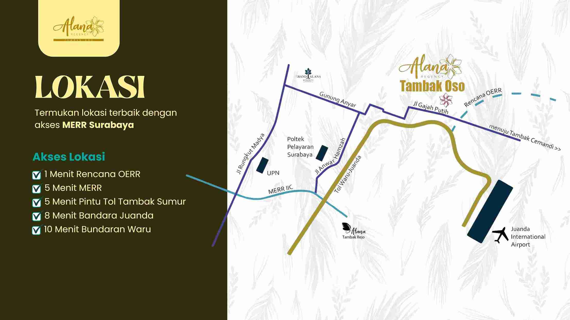 Alana Regency Tambak Oso adalah Hunian mewah strategis di Waru, Sidoarjo, hanya 1 Km dari MERR Surabaya Timur. Start Mulai 500 Jutaan, Angsuran 3 Jutaan. Tersedia pilihan perumahan surabaya timur ada rumah 1 & 2 lantai dan nikmati fasilitas lengkap, di rumah baru surabaya timur ada kolam renang, gym, taman bermain, keamanan 24 jam, dan banyak lagi!